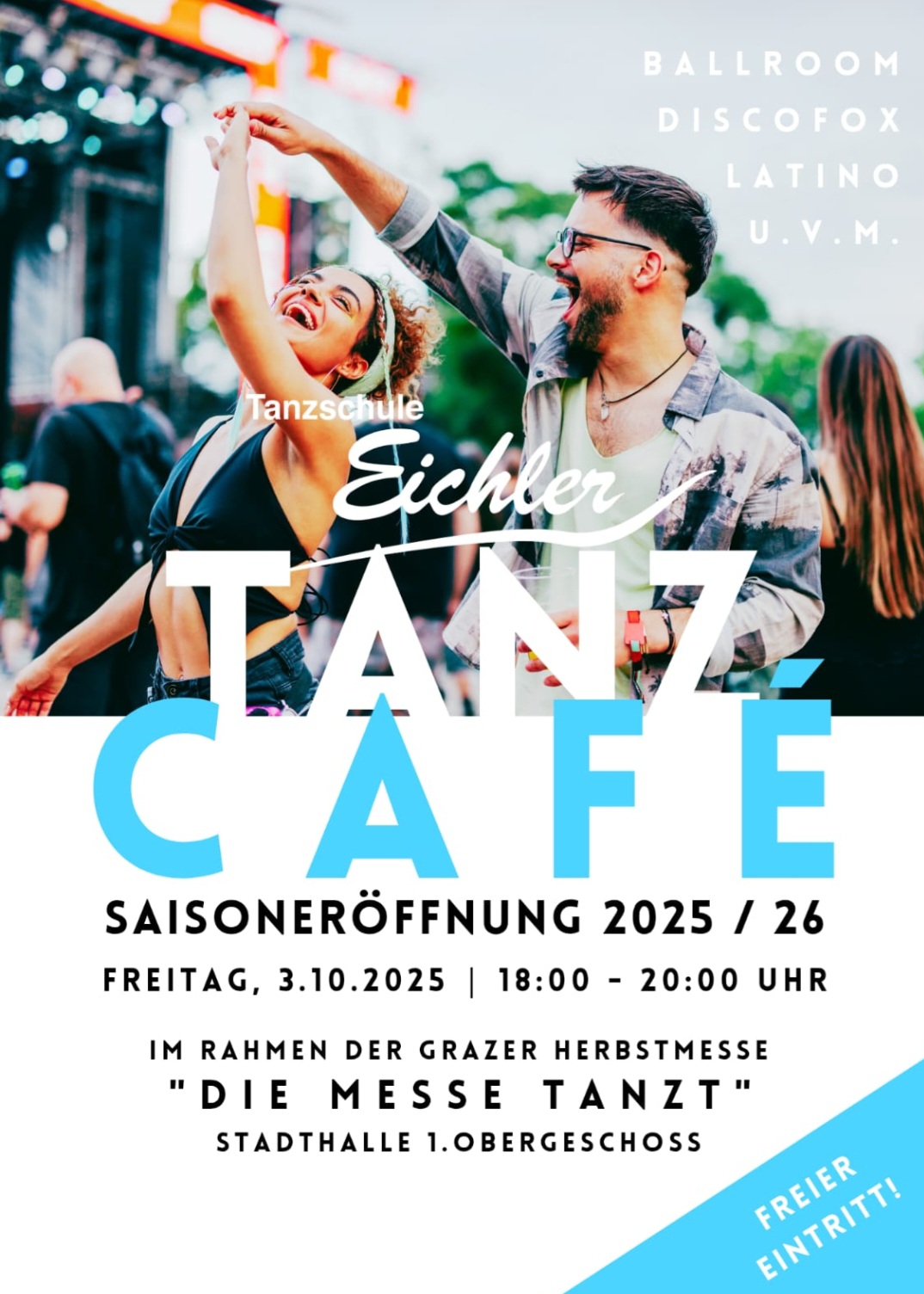 Unsere Tanzcafe - Saisoneröffnung findet heuer im Rahmen der Grazer Herbstmesse “die Messe tanzt” am Freitag 03.10.2025 von 18.00 - 20.00 UHr im OG der Stadthalle statt.
